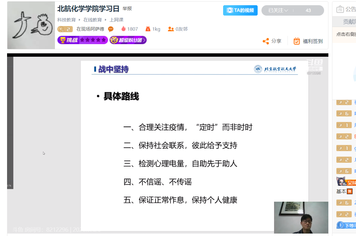 各年级班会以共同的主题——“新学期·新形势·新学风”为开端。辅导员向同学们强调新学期课程改为网络线上进行,提醒学生们,虽然在家,学习上不能放松,务必做好专业课学习和防疫知识的学习。同时,向学生们讲述国家及学校最新的防疫工作精神及要求,要求同学们务必遵守学校及学院的各项管理要求。号召大家在这个“全民战疫”的特殊春季,作为北航学子,要发扬北航“特别能吃苦、特别能战斗、特别能奉献”的优良传统,养好身体,好好学习,天天向上。