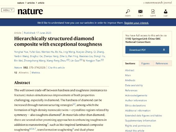 2020年6月18日,Nature杂志在线全文发表了我院郭林教授、岳永海教授团队与燕山大学田永君院士团队在纳米孪晶复合金刚石增韧机制方面的最新研究成果:“Hierarchically structured diamond composite with exceptional toughness”。岳永海教授、高宇飞博士、胡文涛教授、徐波教授为文章共同第一作者,周向峰教授、郭林教授、田永君院士为共同通讯作者。