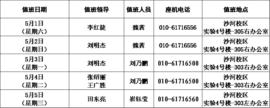 2.学院党政办公室要切实做好节日期间的安全保卫、保密、防火、防盗工作,保证值班人员按时在校在岗值班(08:30-11:30,14:00-17:00),值班领导要求保持手机畅通,遇紧急情况能第一时间赶到现场,确保校园安全稳定,值班领导及人员情况见下图: